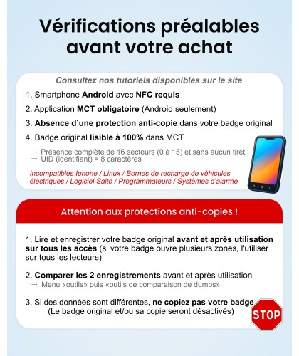 - Protection anti-copie : Veuillez effectuer toutes les vérifications indispensables de votre badge original. La non-vérification de votre badge original peut entrainer sa désactivation et celle de sa copie
